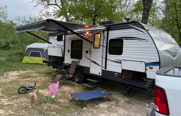 Hello our beautiful camper is up for rent when we are not using it! Everything to need to have a relaxing time at the campground! It is light enough for light trucks and some suvs to pull it! It has and outdoor kitchen with a stovetop sink bowl and refrigerator. On the other side of the trailer is an outdoor shower, for after those long days of kids playing in the dirt and sand!