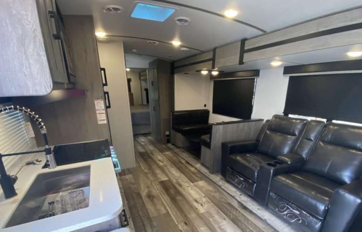 2021 RV, perfect for the long weekend or even longer. This RV is setup with a king-size master bed, in a private bedroom. 50" Television in open floor plan kitchen/dinette/living room. Large refrigerator and sink make this perfect for entertaining. Included is a roof-top solar panel and a second battery for those dry-camping needs.