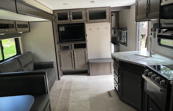 Our camper comes equipped with a coffee maker and everything you would need to make excellent meals. The factory queen size bed for the master bedroom has been replaced with a 12-inch memory foam mattress to ensure that whoever sleeps on it, will rest well. Nice linoleum floors pave the whole travel trailer, the bunks come with USB-powered outlets.