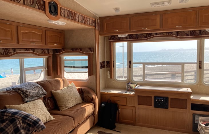 Beautiful 27-foot 5th wheel that can sleep up to 6 people. If location is everything, then you pick the spot and let this rig show it off with its panoramic windows. This 5th wheel has 2 pop-outs, both in the living room to give you an oversized space to sit back, relax and take in the view. There is a comfortable couch which also pulls out into a bed.