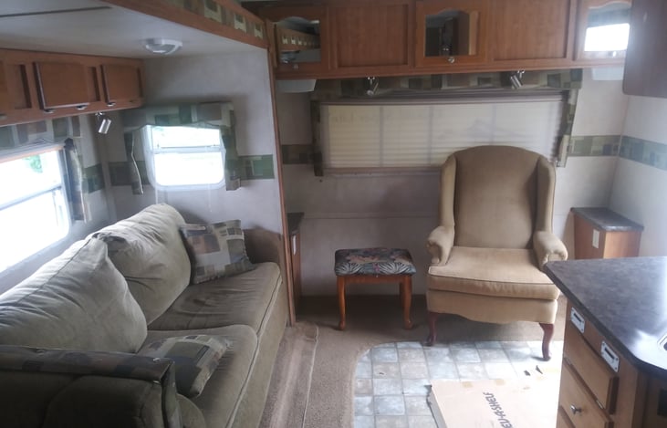 Sleeps 5 great shape veru clean and spacious. Walk around master suite with dressers. Full size bathroom with stand up shower and double vanity and sinks for you and you mate or kids. You won't feel cramped in this RV. Outdoor shower as well. Two entry doors. New flat screen tv. Two slide outs Electric support legs. Great weekender or live in fir long term. Long term adjusted rates.