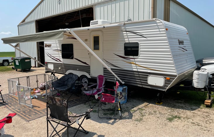 This is a nice open smaller unit. Sleeps 6, nice tub for little ones. Comes with chairs, plates, silverware, bedding, towels and most everything you need for your camping experience. 1/2 ton towable. Go to Northcentralrentals.com for more info