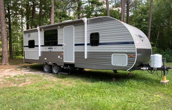 Perfect family travel trailer. Includes linens and toiletries. One queen bed with door to shut off. Couch that turns into bed and two bunk beds. Also has an electric awning so makes it really easy to put in and out. Outdoor and indoor speakers with Bluetooth capabilities. If you have any questions feel free to ask