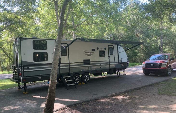 Lovely bunkhouse travel trailer. Accommodates up to 10 people with 2 full bunkbeds, queen master, full sofa bed, and full retractable table. Take your family or friends to the local beaches or state parks nearby. We help stock this RV so you don't have to think about too much to bring outside your clothes and goodies.