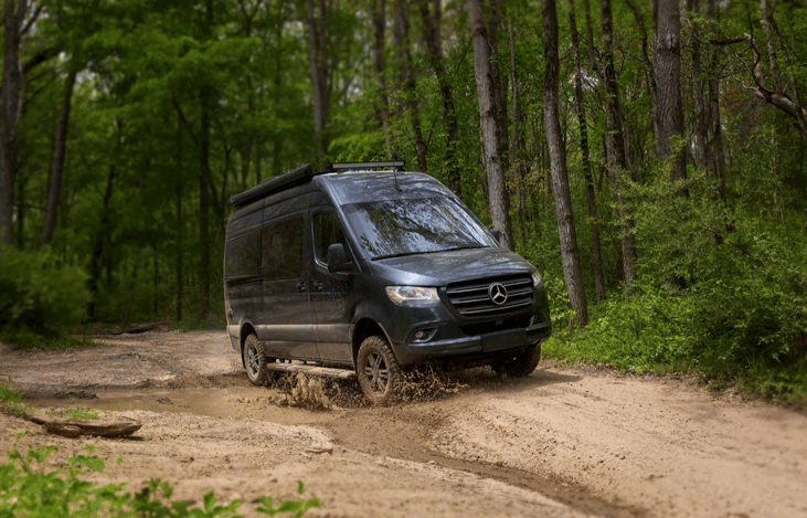 Your journey begins with the safe and convenient keyless entry system. A Mercedes Benz Sprinter 2500 4x4 chassis brings Tranquility to life. The four-wheel-drive system will ease your mind, whether driving to the slopes or the beach. Black alloy wheels and off-road tires will help get you there with ease.