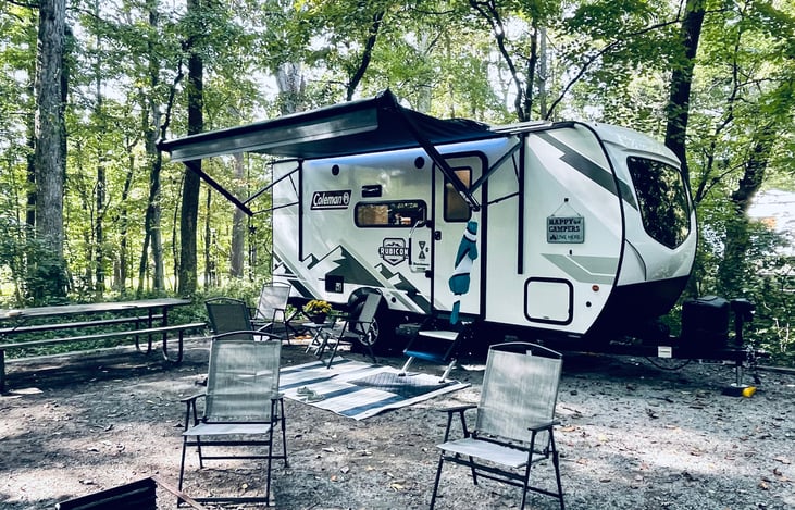 The Happy Glamper 2021 travel trailer perfect for your next family vacation! Think upscale tiny house - brand new with a nautical design and light and airy interior.