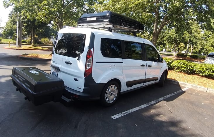 Meet Unite Adventures , a 2018 Ford Transit Connect camper van with a rooftop tent and awning for all your glamping adventures. The Transit Connect comfortably hauls and sleeps 5 people. Let the kids sleep in the 2+ roof top tent and enjoy the warmth of your partner as you stretch out on a nearly full size air bed and two person sleeping bag inside the van.