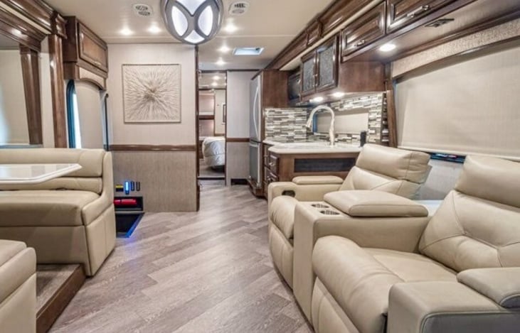 This 2020 new unit will be one of your best rental options. Luxury inside and out with the large cummings diesel engine and air ride suspension. Save on fuel and have the power needed to travel through the mountains. The interior smells new and is sanitized before every rental. With 3 TV's there is a spot for everyone to have their own space and entertainment.