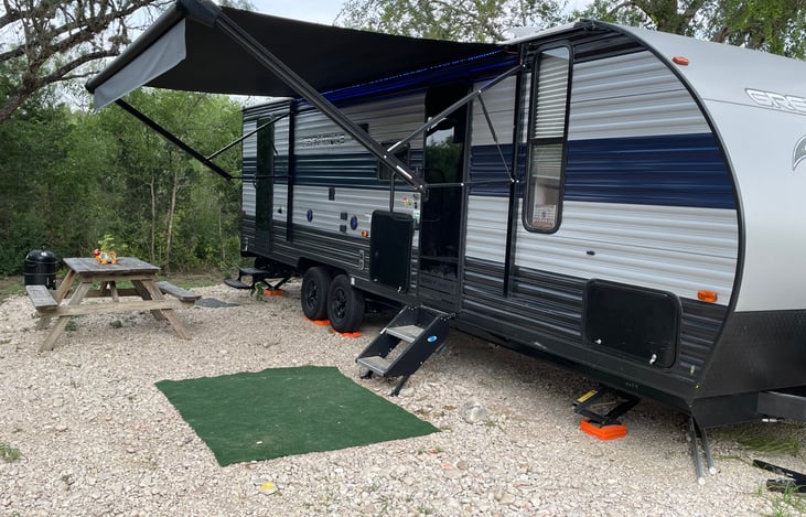 Travel trailer, perfect for your hunting trip or family getaway. Featuring double bunks, shower w/tub out side shower, refrigerator, cooking area. 2 doors for easy access to the bathroom. Spacious slide out, living space with a fireplace. RV rental, delivery and services.