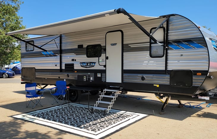 2021 forest river salem is perfect for your families next camping trip. Very spacious at 30ft long with a large slide out. This trailer sleeps 8 adults comfortably and 10 if you have little ones. Mounted tv above a beautiful electric fireplace. Indoor and outdoor speakers. 1/2 ton towable at 7000lbs or can be delivered and set up.