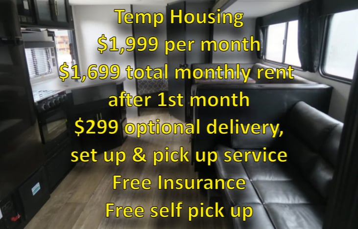 Temp Housing. $1,999 per month. $1,799 total monthly rent after the 1st month. $299 optional delivery, set up & pick up service. Free Insurance. Free self pick up.