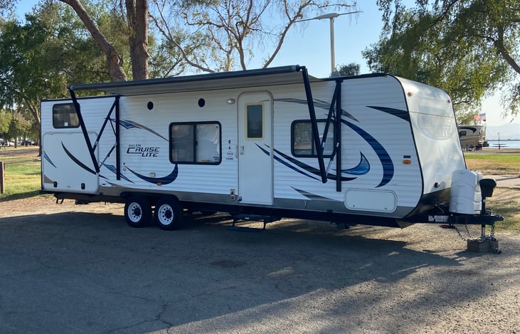 No delivery fee to Buena Vista Lake ! 32 foot trailer with queen bed, 3 bunks in the rear and an outdoor kitchen. After you make your reservation let us know how many people you are bringing and we will help accommodate you with everything you need to help take the stress out of your travels. We only rent our trailer out at Buena Vista Lake.