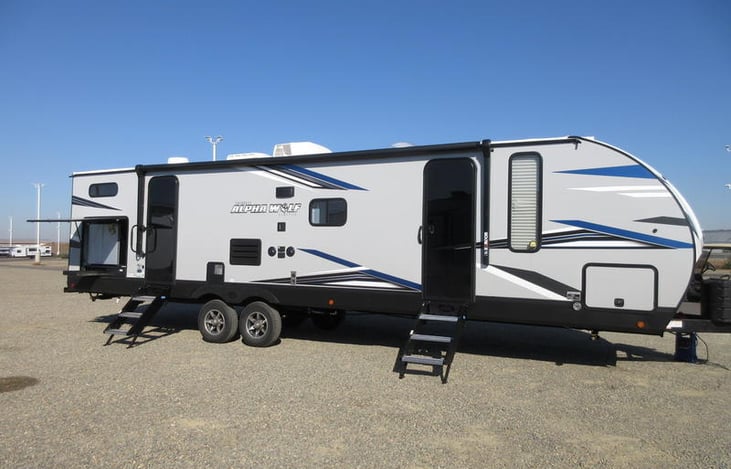 This beautiful NEW Forest River Alpha wolf luxury bunkhouse has room for the whole family! 2 bed room!!! Master has a queen size bed with plenty of storage, 2nd bedroom has 3 bunks. A large super slide with U-dinette and a couch that both make into beds. It is so roomy! 2ND entry do to the restroom, Full size shower & toilet. LED lighting, blue tooth stereo w/ speakers inside & outside.