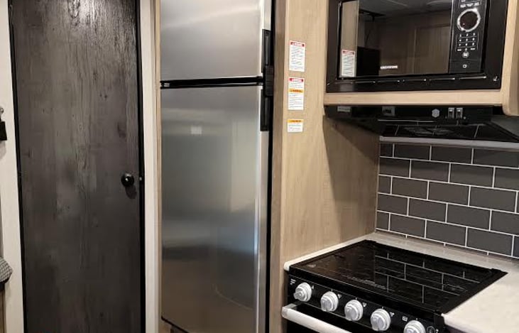 New RV, amenities includes 3 sets of towels, sheet sets for every bed and bunk beds, kitchen utensils, pots and pans, good size refrigerator, coffee maker, dish soap, vacuum cleaner, trash can and bags, paper towel, personal hygiene products, other cleaning supply, hand sanitizer, disinfectant spray, 2 outdoor chairs and outdoor carpet, coloring books and crayons for kids, 1 outdoor game, crossw