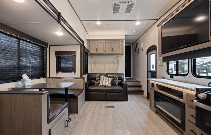 We had a great experience with this RV! The beds were comfortable, the main area was spacious, and it had everything we needed. There were 2 sort of bulky floor A/C units that we weren't expecting, and a fan is mounted on the wall so the door to the bunks doesn't close. But, we were able to work around it and have a great time. Definitely bring your own blankets and towels!
