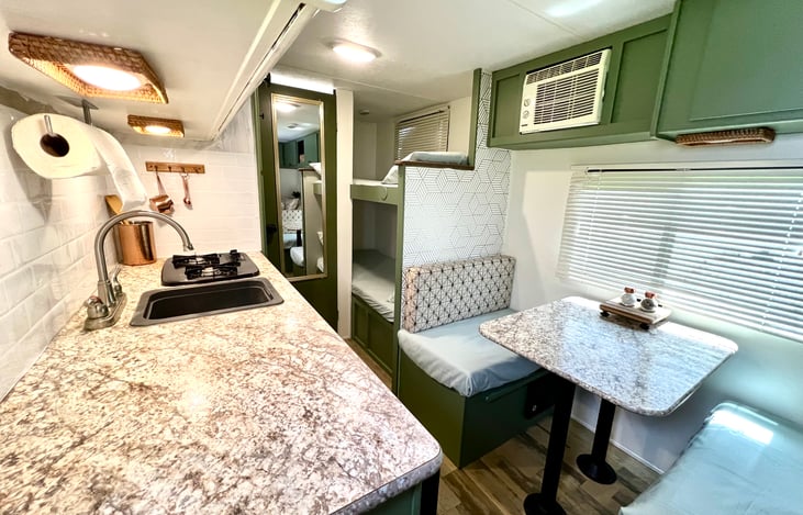 Hi! Rent our 17ft Viking Saga travel trailer! It sleeps 5 people comfortably, has bunk beds, full size bed and table turns into a bed, full size showers and toilet, RV comes ready to rent with clean bed sheets and towels, TV, propane tank full, pots and pans, fold out chairs, outdoor canopy, RV has awning on it, refrigerator, stove, microwave. Ready for your next trip!