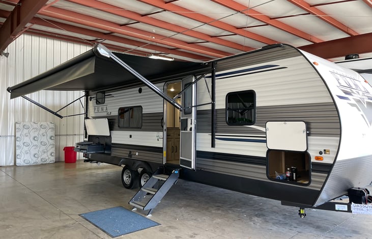 2022 Puma XLE Lite! Will comfortably sleep 8 which includes the queen size bed in the bedroom, fold out sofa, dinette converts into a bed, and has very spacious and oversized bunk beds with curtains for privacy.