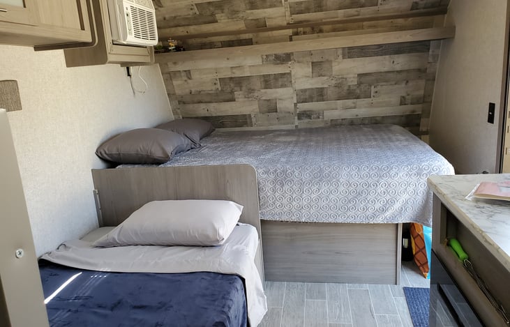 This travel trailer sleeps up to five people. it has a queen size bed 2 bunks and a dinette conversion. It is perfect for a couple or small family. It is fully stocked with linens, towels, dishes, and cookware. This rental is delivery only. We deliver, set up, and pick up when you are done.