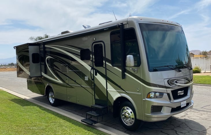 Our 2019 Newmar is a beautiful spacious 32 foot RV with a full wall slide out and a rear king bed bedroom slide out as well.