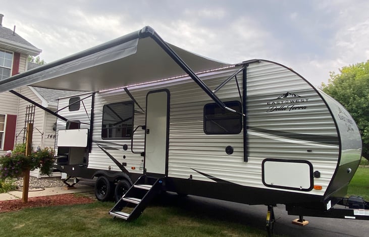Enjoy a fantastic family camping trip in our 2021 East to West Della Terra 250BH. This is the perfect family camper with its master bedroom and bunk beds. The camper will sleep up to 6 adults with extra sleeping space for 1-2 small children. The master bedroom comes complete with a king-sized bed, foam mattress pad, and closet space. It is separated from the rest of the unit by a private door.