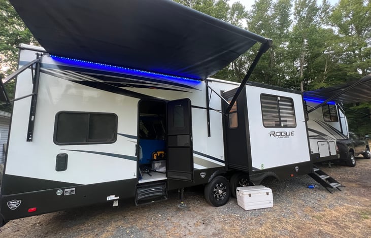 Do you like camping but also like really nice accommodations? I’ve got the camper for you and your family. Can easily sleep 8-11. King bed in master with walk in closet. 2 bathrooms. Extra large couch 3 beds in toy hauler area. 2 which are bigger than king size. On board generator and solar equipped. Comes with chairs and outdoor mat. Kitchen is stocked.