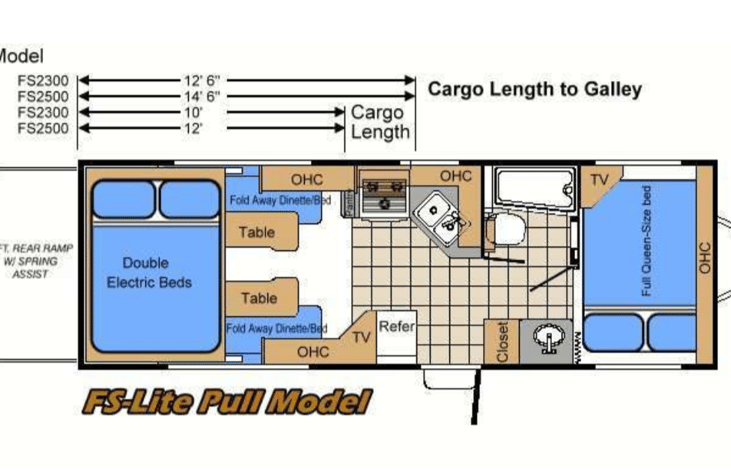 Toy Hauler. Large enough to fit a two seater side by side or razor. Sleeps 6. We'll dump grey and black tanks when you return it.