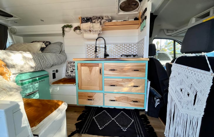 Gloria is a brand new 2019 Ford Transit medium roof that was professionally converted into a camper for those adventure seekers. It comes equipped with two ceiling fans, a vintage style fridge, stove, kitchen sink, and all the cooking supplies you will need. It sleeps two people in a nice memory foam full bed and has a slide out table to convert the inside benches into an eating area.