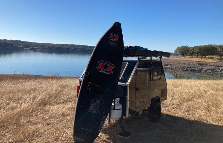The modern teardrop-shaped RV, compact in size, can be pulled by the family car or a small SUV equipped with a hitch but have a basic kitchen, bathroom, and sleeping area. Top tent sleeps 2 and inside sleeps 2.