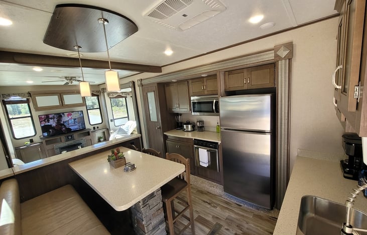 "MADAME" is the queen of all campers - A HOME AWAY FROM HOME. Step into a gorgeous luxury rig with tall 8' ceilings, large bay windows that add light, stainless steel appliances, a built-in vacuum, and a master king bed with memory foam topper and chifforobe with plenty of storage!
