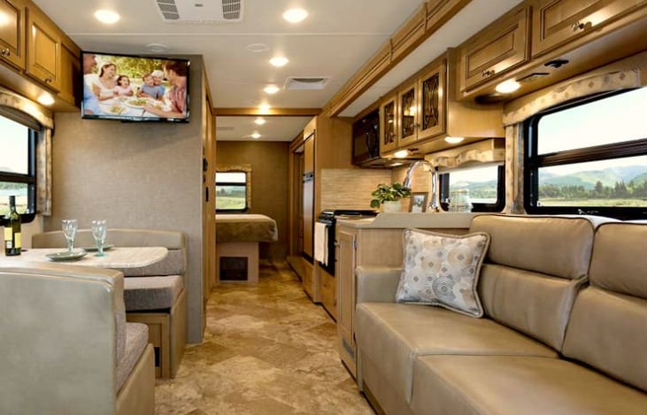 Beautiful, cozy home on wheels. Updates include full leather, brand new audio system, take your home office wherever you move, class A in every sense, 3 TV entertainment systems in living, bedroom and outside patio, easy to use for beginners. With a cubby above the drivers seat, and a pullout bed, it can easily fit about 7-10 people.