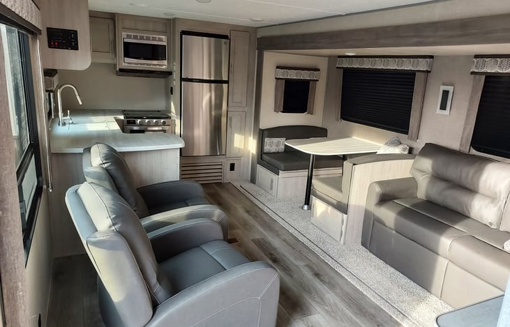 2022 Catalina Legacy 283RKS. King bed! Roomy, spacious interior, with large living room. Large, u shaped dinette. Multiple seating areas, flat screen TV, and a fireplace! Sleeps 5-6, the couch is a queen bed, and the dinette converts to a full size bed. As always, this camper is fully stocked, pots, pans, utensils, tableware, all the small appliances you need.