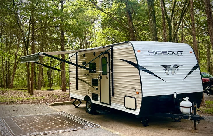 Take the whole family and enjoy the outdoors! Our 21.5' Hideout offers queen bed, two bunks and a dinette that makes a bed. Enjoy a two burner stove, microwave, refrigerator, and bluetooth audio with inside and outside speakers. Bathroom with shower and vanity. Ample storage. Electric awning extends with the push of a button.