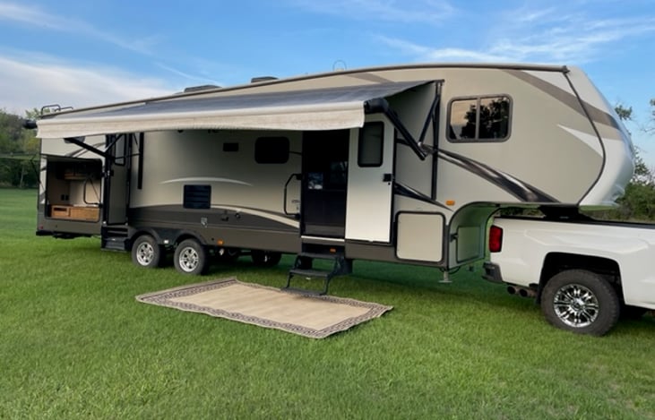 34' 5th wheel, Sleeps up to 8 people comfortably. Slideout Bunkhouse sleeps 4 comfortable, includes TV and is its own separate room! Living room has slide out with very comfortable couch that converts to bed to sleep 2 more and has TV/DVD Player. Radio plays indoors or separate channel for outdoor speakers so you can listen to whatever you want while enjoying the outdoors.