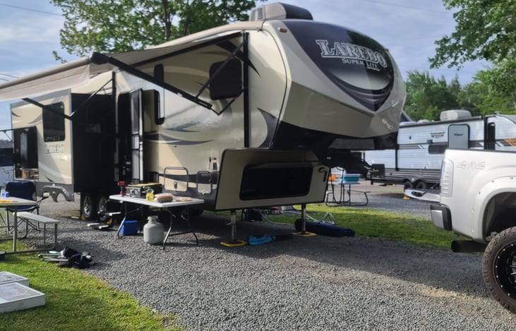 We have a spacious 35 foot Fifth wheel! It has plenty of room to relax inside with very comfortable theater seating, 2 person couch (which folds out to a full size bed). Full entertainment in the rear. TV, DVD, mp3, aux, and Bluetooth. Full surround sound. Has a nice island in the kitchen with nice size sink to clean up after cooking. Also a roomy 4 person dinette, which also folds down to a bed.