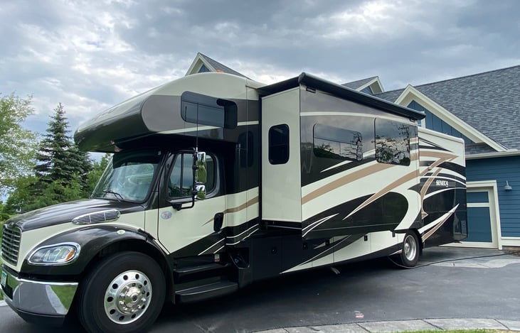 Our RV is a very clean Super C class motorhome, built on a Freightliner chassis. There is a lot of storage under the motorhome, so bring your stuff! Our rig is fully furnished and comes complete with a microwave, stovetop, shower, refrigerator, freezer, 3 televisions, generator, bike rack, washer and dryer. Just bring your own food and personal belongings!