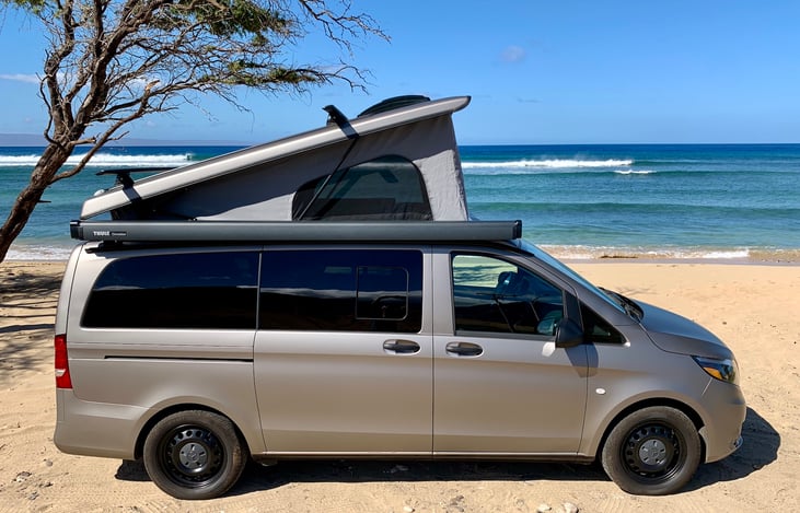 Located in Kahului on the beautiful island of Maui, Sunset is one of Campervan Hawaii’s Mercedes Metris pop-top campervans with seating for 5 and is great for cruising around the island.