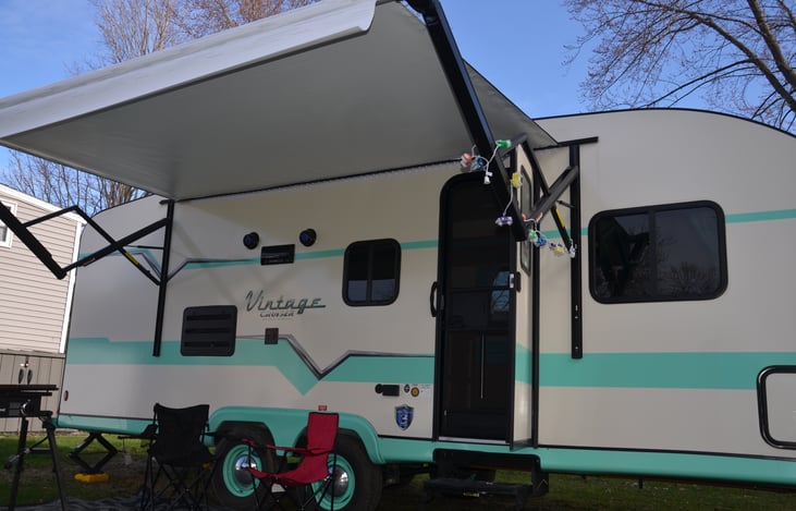 This camper is brand new and ready to go on adventures! Go glamping in style while remembering the “good ole days.” This camper is built to look like a camper straight out of the 1950’s while still having all the modern day amenities like AC, power awning and a microwave! You can have everything that you have at home, all on wheels, able to go anywhere you can imagine.