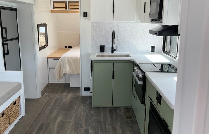 This trailer has a full service with a large kitchen counter. Electric fire place below the TV that actually blows warm air! It has a fun and modern color scheme of white, tan and sage green.
