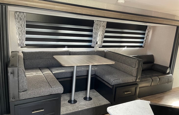 Check out this NEW CAMPER! Our travel trailer is 37’ long, fully loaded and sleeps 9. There are two bedrooms with closing doors that allow for privacy. The main bedroom has a queen size bed with plenty of storage and the back bedroom has a lofted bed and bunk beds sleeping 3.