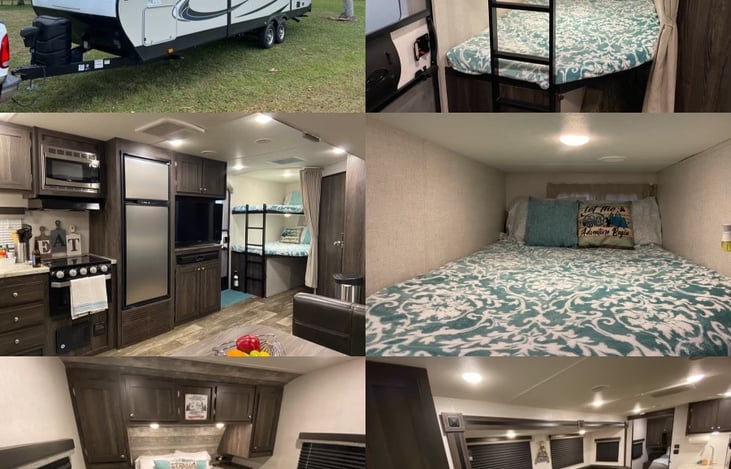 An outside kitchen, double bunk beds for the kids, and a large slide out make this travel trailer the perfect family unit! Prepare eggs and bacon each morning on the three burner cooktop or use the microwave for oatmeal before heading outdoors for a bike ride.