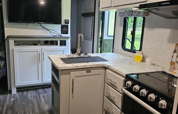 The interior is beautifully crafted with white shaker cabinets. Relax on our U-shaped dinette with family or friends.
