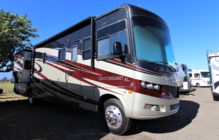 Travel in style in this 36ft. Georgetown with split bathroom, 2 slide outs, sleeps up to 7 people with a queen master bedroom, full sofa sleeper and a dinette bed.
