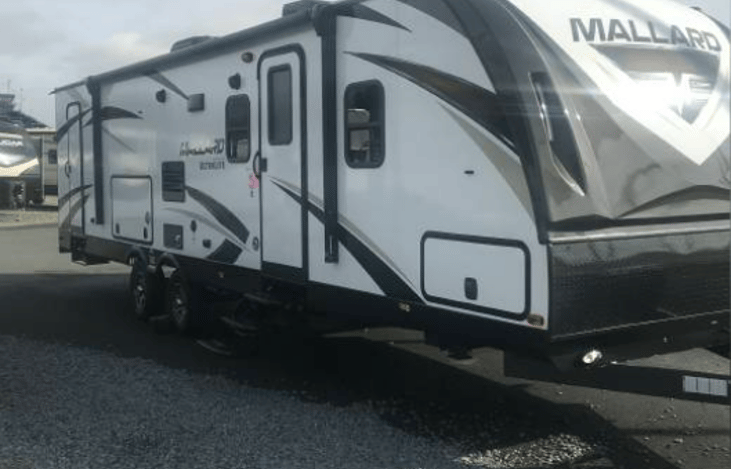 2019 Heartland Mallard Travel Trailer sleeps up to 10 people (combination of adults and children) with a queen in the separate master bedroom, a set of queen bunks, and both a dinette and couch that convert to sleep as well. The kitchen is equipped with a sink, fridge/freezer, oven/stove, and microwave. The bathroom includes sink, toilet, and shower.