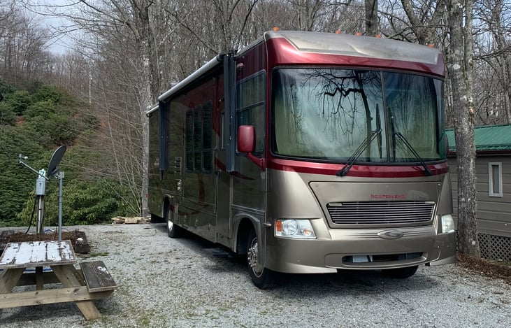 32 foot Class A motor home with two slides. Generous lot with beautiful views and bordered by mountain sanctuary private lands. Lovingly maintained with full kitchen, keurig coffee maker and full length queen bed with luxurious bedding. Queen size futon in living room. Outdoor seating for 4 and fire pit and picnic table.