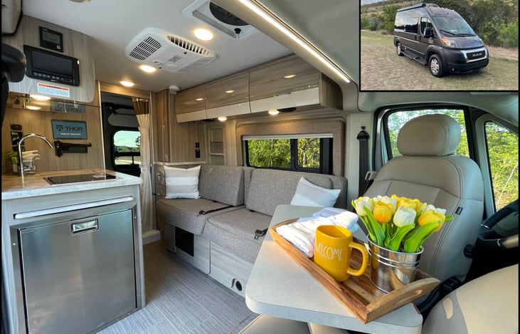This modern self-sustaining Class B Campervan travels 4 and sleeps 2 while providing the amenities of home with the ease of driving a van! See the Outdoor Package to provide additional sleeping accommodations. Take your partner on a roadtrip to see some of the beautiful state and national parks this country has to offer or take it on a roadtrip to wherever you need to go!