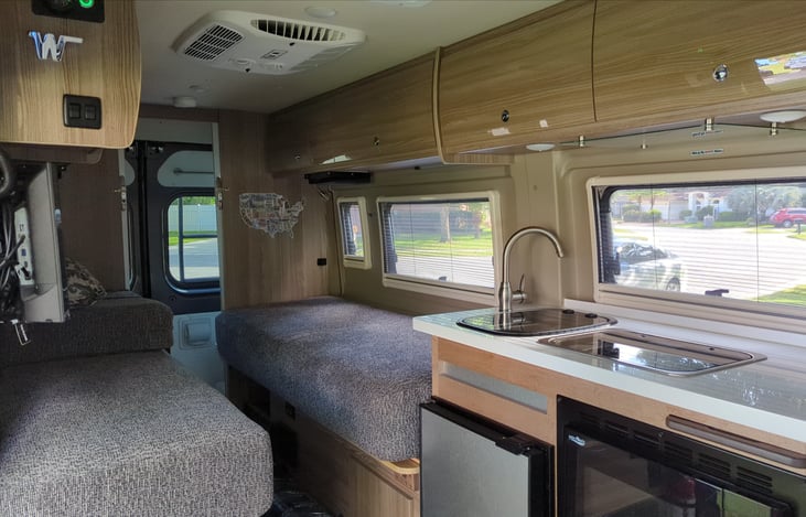 Vantasy (2021 Winnebago Travato 59K) is practically new - still sparkly and shiny clean! It is perfect for one or two people. You will have two very comfortable swivel seats, a kitchen, a bathroom and shower and two twin beds (which can be transformed into a single "almost king").