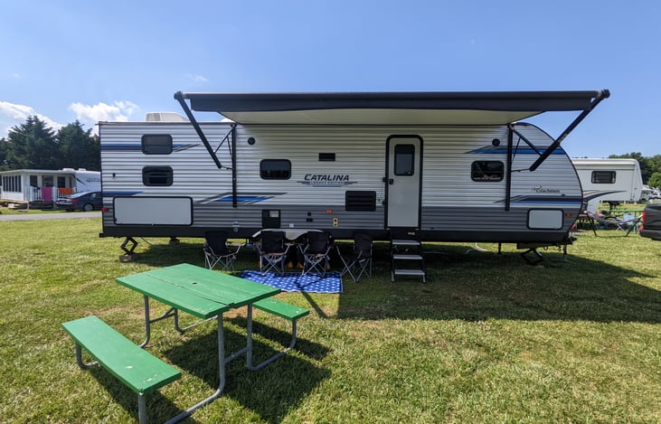 Decked out for your next adventure! 2020 Coachman Catalina Legacy Edition Travel Trailer. This camper has a Queen bed, 3 single size bunk beds, a fold out couch (full size bed) and U- Dinette (that converts close to another full size bed).
