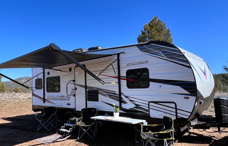 My husband and I love camping especially in the toy hauler. We love the ability to boondock in some of the most gorgeous locations as a lot of campsites are booked out. We enjoy being in the mountains, at the beach, or stargazing in the Nevada desert. We would like to offer our trailer for other families to enjoy the outdoors as we do. See you soon and let the adventure begin!