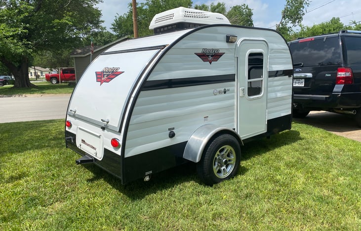 Charming retro style camper with sleek retro look. Unit sleeps 2 on queen bed with easy access double doors on each side. Plenty of cabinet space inside cabin. Stay cool with rooftop AC. Trailer is fully equipped with outdoor rear kitchen with appliances, kitchen utensils, and 2 burner gas cooktop and sink.