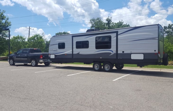 Room for the whole family!! With a queen bed, a twin and single bunk, leather couch that reclines into the bed and more sleeping options, you'll have plenty of space for everyone. We have enjoyed this RV from Tennessee all the way to the Upper Peninsula of Michigan! There is a tv and radio with blue tooth as well as exterior speakers for when your playing games or enjoying a fire.